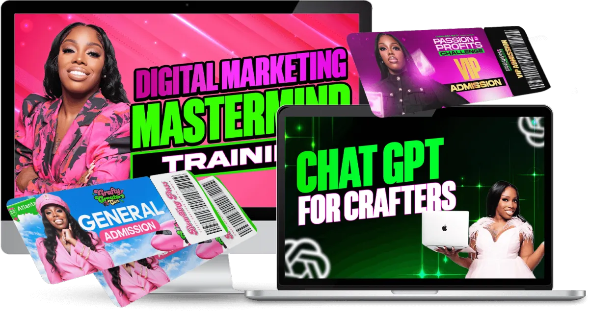 You’ll receive access to Chat GPT for Crafters, a VIP Ticket to the Passion 2 Profits Challenge, a General Admission ticket to Crafty Con and the Digital Marketing Mastermind Training.